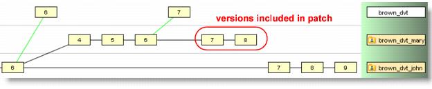 In this command, version 4/8 (brown_dvt_mary/8) was patched into version 5/9 (brown_dvt_john/9), and the result was kept as version 5/10 (brown_dvt_john/10). The backward search through the file’s ancestry identified 4/6 (brown_dvt_mary/6) as the basis version.
