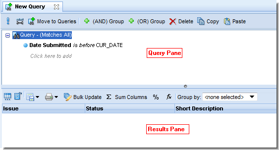 You use the Query pane to can create, modify, and run AccuWork™ queries. When you run a query, AccuRev retrieves the set of AccuWork issue records that satisfy the query from the AccuRev depot and displays them in the Results pane.