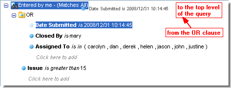• Simple clauses, such as Assigned To is mary (can appear at any level). Every query has at least one simple clause.