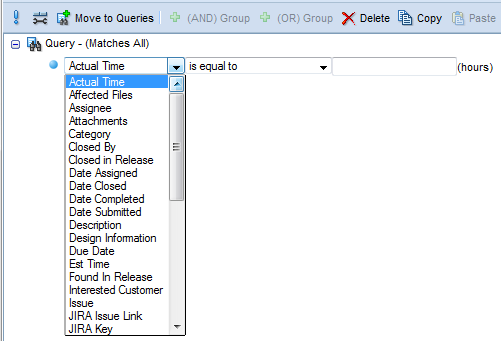 • Compound clauses, which start with AND or OR. These clauses can contain any number of other simple or compound clauses.See Creating a Query for more information on using the tools in the Query pane to create an AccuWork query.Allows you to specify which columns (AccuWork fields) are displayed in the Results pane for the selected query. You can optionally save selected columns as a default set to be used to display results for any new queries you create. This command is disabled for public queries created by other AccuRev users. See Set up Columns for more information.Tip: The Delete key on your keyboard also performs the delete action.Copies the currently selected query node (the current clause and any subordinate clauses) to the clipboard. See Copying and Pasting Conditions and Clauses on page 66 for more information.Pastes the contents of the clipboard into the currently selected query node. See Copying and Pasting Conditions and Clauses on page 66 for more information.Allows you to change field values for multiple issues in a single operation. For example, if you assign an Owner to issues, you can use Bulk Update to change the Owner from unassigned to Henry. See Bulk Update for more information.Returns the number of issues selected, as well as the sums of all Text fields with numeric-only data and the sums of all Timespan fields. See Sum Columns for more information.Allows you to perform basic mathematical operations (add and subtract, for example) on any two columns with numeric values. Available from the toolbar only. See Calculate Columns for more information.Toggles the display of percentage information for the grouped issues. Available from the toolbar only. See Show Percentages for more information.Groups the issues shown in the Results pane by the issue field chosen from this drop-down list. Available from the toolbar only. See Group Issues by Field for more information.Tip: When you group issues, AccuRev enables graphical reporting tools such as pie charts and bar charts. See Charts for more information.