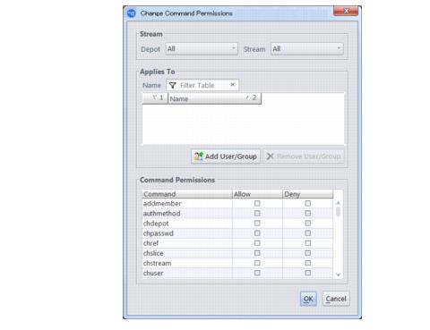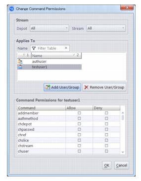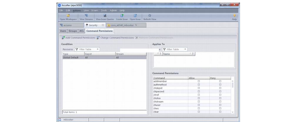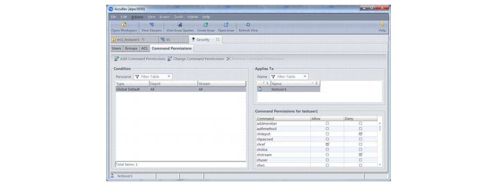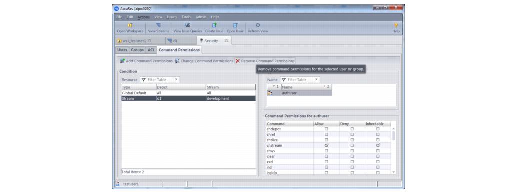 Release 7.1 introduced a new graphical user interface that enables the AccuRev administrator to configure which users are allowed to execute a variety of administrative level commands. This is an alternative to writing perl script in the server_admin_trig.bat or server_admin_trig.pl files installed in the <ac-install>/storage/site_slice/triggers directory.This configuration page is accessible from the Admin menu underneath the Security option. The “Global Default” Condition allows you to configure admin command permissions for the entire site. Command permissions can apply to an individual user or to a specific group of users. You can also apply permissions broadly to the two built-in groups:In the case that permissions have been configured for both a user directly and a group that the user is a member of, the permission setting closest to the user is the one that applies. For example, if a user is a member of the qa group and the qa group is denied access to the chstream command, but the user is specifically configured to be allowed permission to the chstream command, the user’s own permission is the one that applies.In order to set or remove admin command permissions, you must either be a superuser or have been granted explicit Allow permission for the setcmdacl and rmcmdacl commands. To designate a user as the superuser, the AccuRev administrator must use the maintain utility:Either highlight the condition you want to edit and click the Change Command Permissions button, double-click on the condition, or right-click on the condition and choose the Change Command Permissions context menu option. The following dialog will appear:For commands that apply to a stream or stream hierarchy, you can add a new condition for that stream and configure command permissions that you want to apply to it only. You can also choose to make your command permission setting inheritable so that it applies to the entire stream hierarchy below the specified stream. For example, suppose you want to allow users to change the streams in the development stream hierarchy, but you don’t want anyone to change streams above that level. To accomplish this, you could deny access to chstream in the global default, but set an explicit inheritable Allow permission for the chstream command on the development stream:To remove a condition entirely (except for the Global Default Condition), highlight the condition and click the Remove Command Permissions button. To remove command permissions for a specific user or group from a condition, highlight that condition and select Change Command Permissions. In the dialog that pops up, remove the users and groups that you no longer want permissions to be set for.