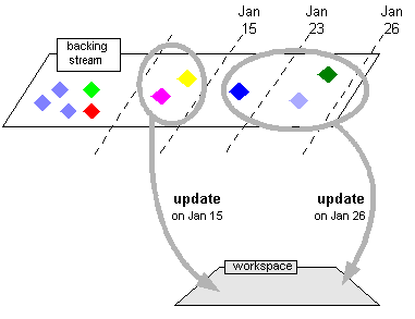 As new versions enter a stream, they become available to the sub-tree of streams and workspaces under that stream. But AccuRev never copies a new version of a file into your workspace automatically. Instead, you periodically use AccuRev commands to update the workspace. This replaces existing files (or adds new ones), so that the files in the workspace accurately reflect the stream’s versions and path elements, including any recently-arrived versions. AccuRev