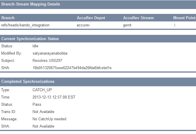 The Status Monitor displays information from the GitCentric bridge for current and completed synchronizations for the selected branch-stream mapping. The Status Monitor updates every five seconds during an import or export operation.