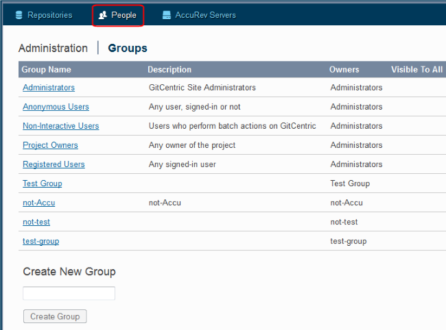 Group membership determines access rights in GitCentric. Use the Groups page to list existing groups, create a new group, and to access details about an existing group.