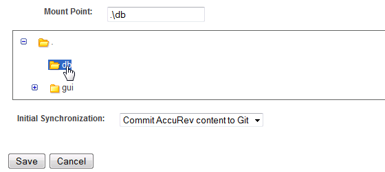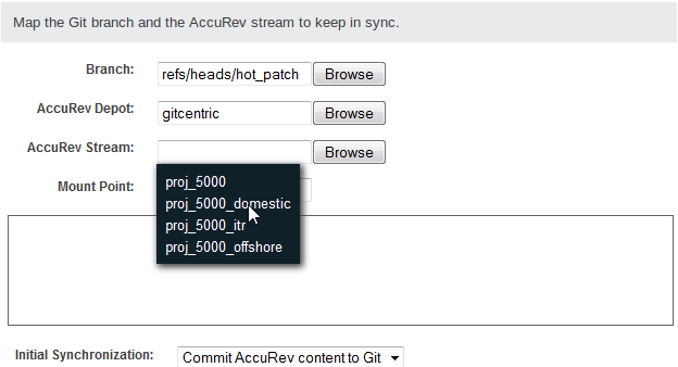 The Mount Point is the directory within the stream that will synchronize AccuRev and Git content. GitCentric provides a display that allows you to navigate to the desired directory. You can select the root of the file system within this stream, or a subdirectory, which populates the field. The folder you select determines which AccuRev-controlled files will populate your repository.