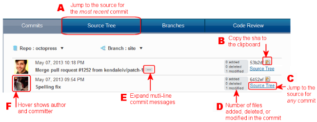 - Displays the names of the commit author and committer when the pointer is placed over the gravatar (Globally Recognized Avatar).