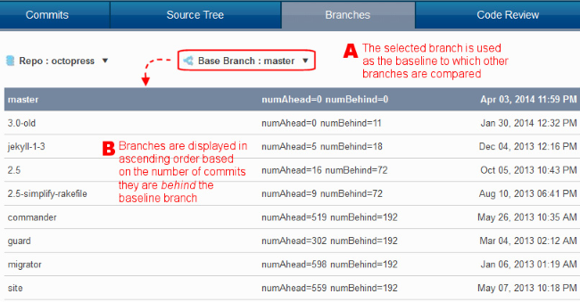 The branch you choose as the baseline is moved to the top of the page and highlighted. The other branches in the repository are displayed in ascending ordered by the number of commits they are behind the baseline branch (numBehind).