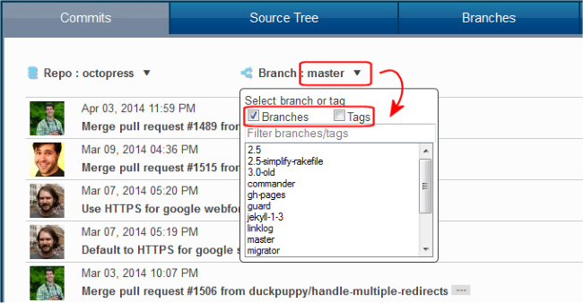 Commits page to view the commit history of a specific branch or tag. You can locate a branch or tag using its name.