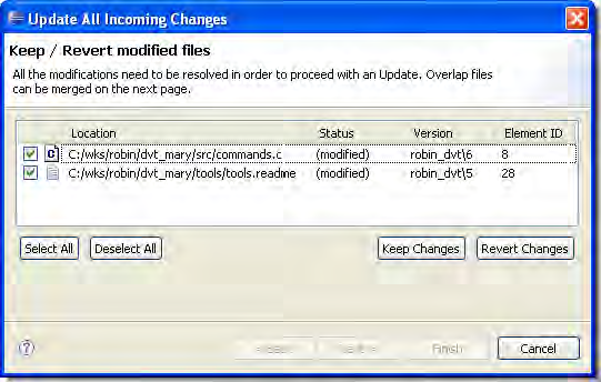 Eclipse uses the CVS term update to mean the transferring of changes from the repository to your project. AccuRev also uses the term “update”. Sometimes, clicking the Update All Incoming Changes button in the Synchronize view toolbar simply performs an AccuRev Update command. But it sometimes launches a multiple-page wizard, which leads you through some operations to be performed before the AccuRev Update command proceeds.