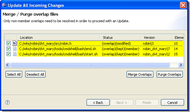 The wizard’s second page handles files with (overlap) status. If you chose not to handle one more files with (overlap)(modified) status on the preceding page, they appear here.