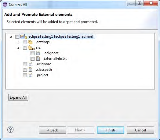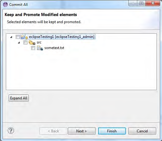 These operations are organized into a series of pages. On each page, you can select none, some, or all of the eligible [outgoing] elements to be processed. The AccuRev operations take place when you click Finish on the wizard’s final page. The following example shows the wizard screen to keep and promote (modified) elements.