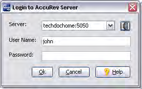 AccuRev user name and password, as shown in the following illustration of the login dialog box for the