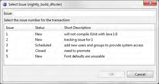 Otherwise, the prompt window offers a set of existing issue records, from which you can select one or more. You can also enter an issue in the Issue # field. When a “3pty ITS Key” is set in the AccuRev Schema editor, that key is displayed instead of the issue number.