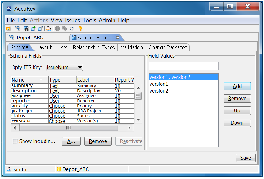 The “versions” field can be defined as Choose or Text type. If the version is a combination of more than one version, the combination should be set up as comma separated in the AccuWork schema as shown in the following example.