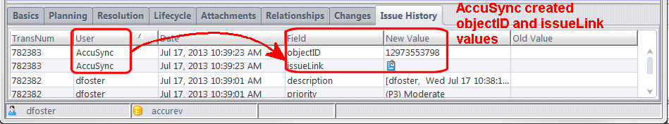 AccuRev recommends that you create a distinct AccuSync user in AccuRev and in your ITS, and that you use this user -- and only this user -- when specifying the connection settings in your AccuSync Configurations. The AccuSync user name you specify is the user AccuWork associates with changes made by AccuSync during synchronization. When a record is updated with changes resulting from synchronization (as when an objectID or issueLink value is created, for example), the AccuSync user name appears in the User column in the Issue History tab for that change, as shown here: