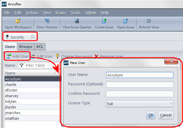 In AccuRev, you create users on the Security tab, as shown here: