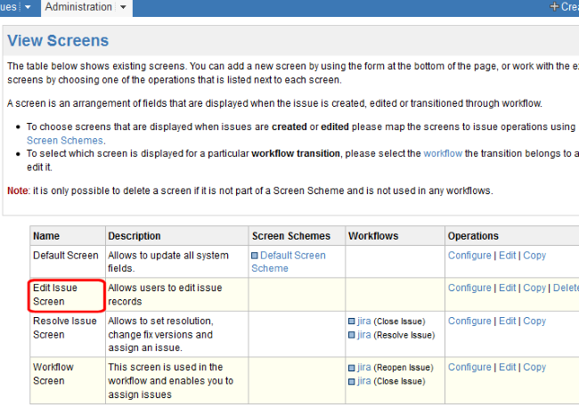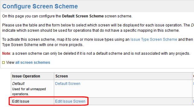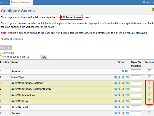 JIRA View Custom Fields page only after AccuSync has performed a synchronization task. You need to ensure that these fields are not editable. There are a number of ways to accomplish this, including making the fields read-only, hiding the fields, or creating an edit screen that does not display them. This last approach is described here. Refer to your JIRA documentation for more information.To remove AccuWork fields from the edit screen in JIRA, you need to: