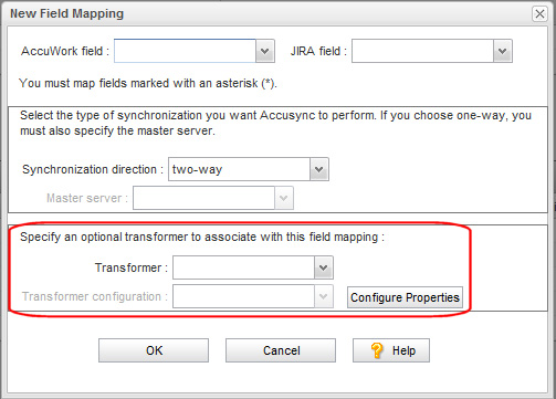 Some transformers are selected automatically based on the fields you map if they are specified for your ITS. For example, if you are using JIRA and map the owner field, AccuSync automatically selects the JIRA Username to AccuWork Username transformer.