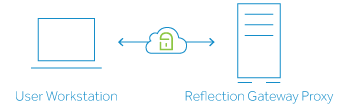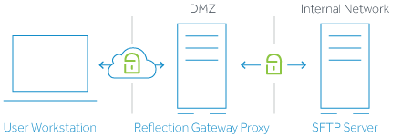 Transferring files to and from an added SFTP server is recommended for most environments. If you run the Reflection Gateway Proxy in the DMZ, you can configure Reflection Gateway to transfer files securely to and from an SFTP server running behind your firewall. In this configuration, data streams continuously through the Reflection Secure Shell Proxy, eliminating the need to save data on the system running the proxy.