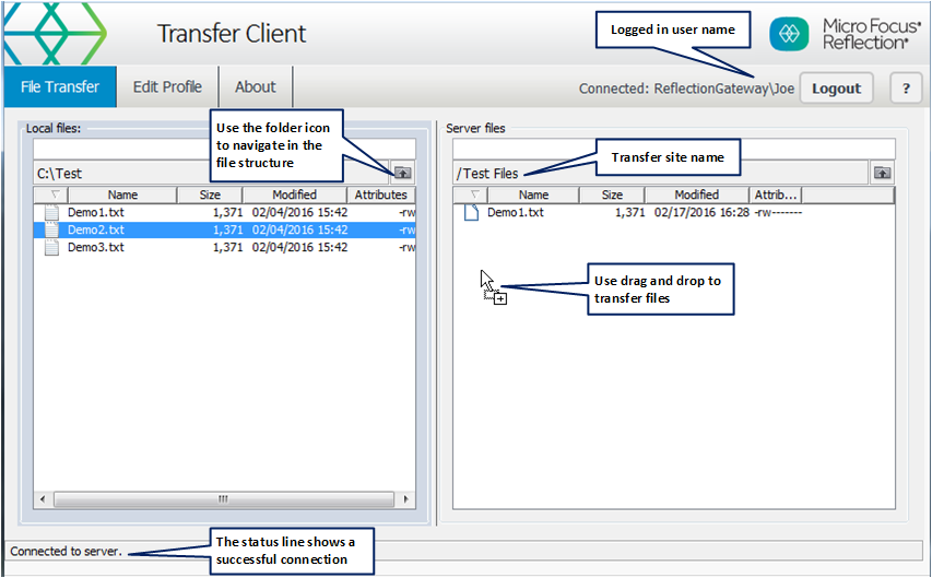 The sample Transfer Client connection shown below points out key features of the Reflection Transfer Client user interface: