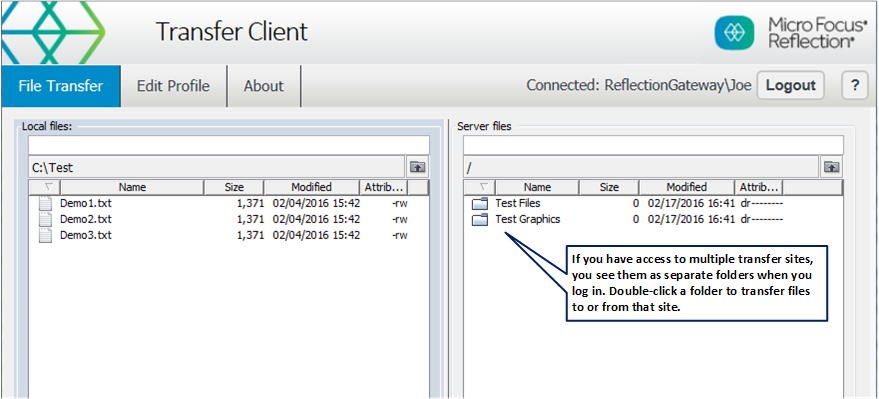 The image below shows a connection made by a user with access to two Transfer Sites: