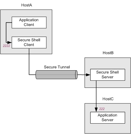 In the configuration shown above, the application client and the Secure Shell client both run on HostA. The Secure Shell server and application server both run on HostB. All data sent to port 2222 on HostA is forwarded to port 222 on HostB. In this arrangement, all data in transit is securely encrypted. The following command (in which localhost identifies the loopback address on HostB) configures this: