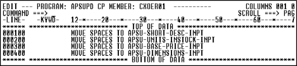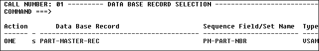 The Parts Update program queries, updates, and deletes a record, so you must define a call to obtain, modify, and erase that record. You do so by entering an action code next to the record that Online Express displays on the Database Record Selection screen.