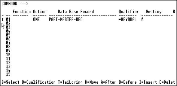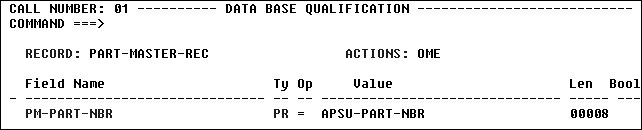 Then, on the Database Qualification Selection screen, you define selection criteria for the Obtain access by entering an operator and a qualification value next to the field. In the Parts Update program, the part number of the record to be retrieved from the database must equal to the number entered by the end user in the PART-NBR field on the Parts Update screen.