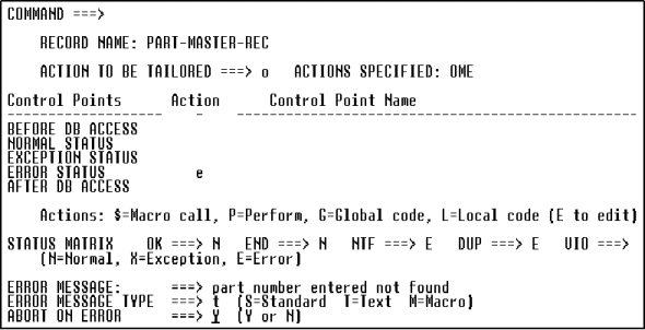 The Status control points on Database Call Tailoring let you insert a program stub to alter the standard error processing. This logic executes after the database access.