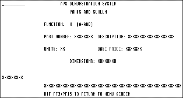 Start this procedure where the last one ended -- on a blank screen in the Screen Painter. Figure 5-3 illustrates the Parts Update screen to paint.