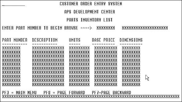Multiple occurrences of data, displayed in a repeated record block. For example, your screen might display rows of information about many items in inventory, as shown in Screen Displaying Multiple Occurrences of Data. Because this sample program has just one function--query--a function field is not required. The end user starts the query by entering a part number in the record key field. The developer has assigned the F(orward) and B(ackward) functions to the PF8 and PF7 keys so that the end user can press these keys to scroll through the repeated record block.