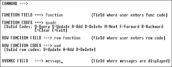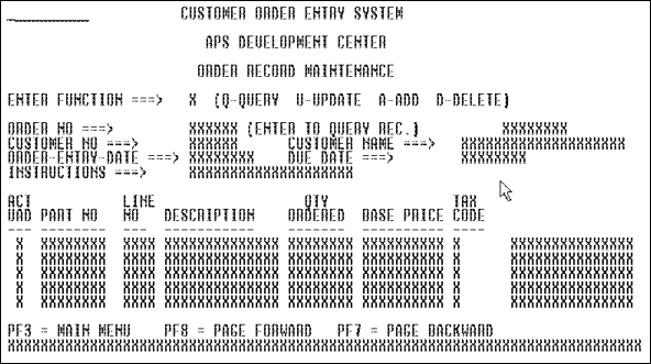 One occurrence of data at a time. For example, your screen might display the name, address, and other information about a particular customer, as shown in Screen Displaying One Occurrence of Data. To query the record in this example, the end user enters q(uery) in the Function field and a value in the record key field, Customer Number. The developer has assigned the S(end) function to the PF3 key so that the end user can press PF3 to display the Main Menu.