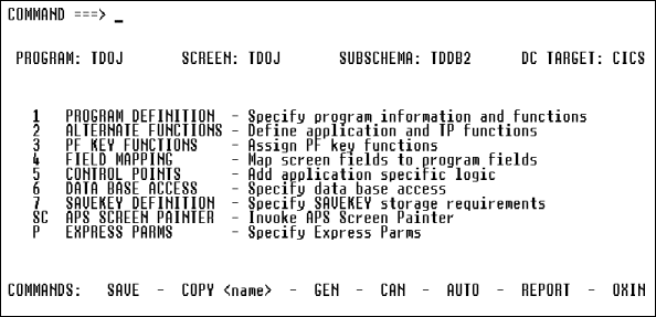 You complete your application by defining its processing logic using Online Express, a menu-driven painter that offers a fill-in-the-blanks approach. Online Express references the information that you have specified in the other APS painters and importers, and prompts you to define the processing logic for those specifications. You do the following to complete your application in Online Express: