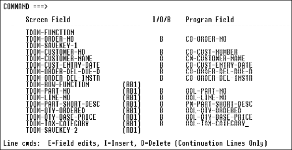 Alternatively, to save yourself some typing, copy all the screen field names to the Program Field column by entering an asterisk (*) in the Command field. Online Express copies all screen field names--except function, system message, and savekey fields--without their prefixes, to the Program Field column. In addition, Online Express enters the value b(oth) in the I/O/B column for all copied fields. Then, modify the names as necessary. To add a prefix to some or all fields simultaneously, use the prefix command.