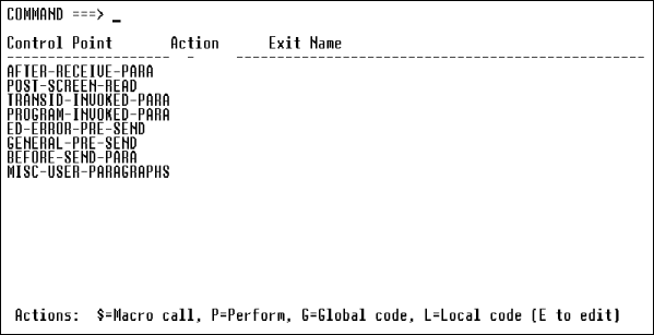 The set of control points that might appear in your program is shown below. Because programs vary, you will see a different subset of control points from program to program, depending on which functions you define for them. To view the control points in your program, you display the Control Points screen. In addition, you can look in your generated program source to see where the control points occur; APS generates comments that identify them that you can activate or deactivate. To activate these comments, set the value of the Control Points Comments field to yes on the Express Parms screen. To access the Express Parms screen, enter p in the Command field on the Online Express Menu. The complete set of control points is as follows: