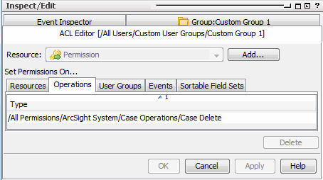 By default, new user groups added under Custom User Groups are not allowed to delete cases. The ability to delete cases is controlled by the permission, /All Permissions/ArcSight System/Case Operations/Case Delete, set in the group’s ACL Editor on the Operations tab.