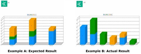 You might encounter unexpected results in your bar charts (stacked or not stacked) if you are plotting data on the X-, Y-, and Z-axis. Consider the following stacked bar charts, where the expected result is shown in Example A but the actual result shows as Example B. In Example B, the stacks seem to spread out along the X-axis as separate data points (the samples are only to represent the behavior described in this topic).