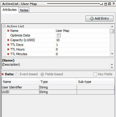 The active list definition includes the following two fields with names and types as shown. "User Identifier" is set as the key-field. This information is available in incoming events (badge swipes and user logins). Each user identifier is mapped to a UUID. Assume, for this example, that we got this mapping from IT or Human Resources departments. The UUID value is the information we’ll want to extract from this list via a variable.