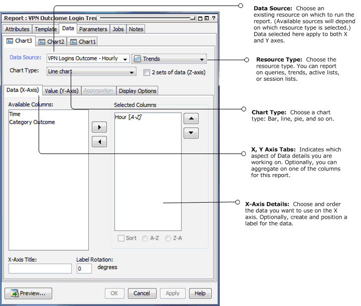 From the drop-down menu, select an existing data source you want to use for the chart in your report. The data source drop-down menu provides a list of existing resources based on the resource type you selected in the accompanying drop-down. You can report on queries, trends, active lists, or session lists. When the data source is selected, the remaining elements of the Data tab populate with the data available in the selected resource. |