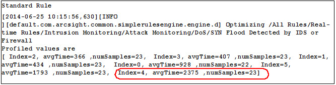 To locate the information in the log file, search for the rule’s name. The following example shows the log statements that include the evaluated rule’s URI (shown to be under Real-Time Rules) and a sampling of the profiled values. The profile describes the average time in nanoseconds a specific condition took to process. The condition’s position is indicated by an index starting with position 0. The profile in the log indicates that the costliest condition at Index 4 took an average of 2,375 nanoseconds over a sampling of 23: