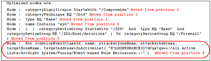 Optimized nodessection. - Edit the rule by re-ordering the rule conditions to match the log's optimized sequence.