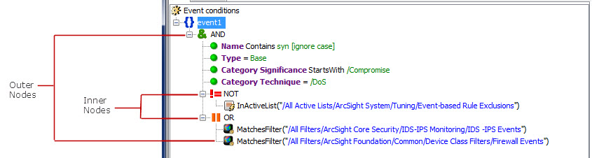 Evaluating event conditions is one of the most resource-intensive operation in event processing. ESM evaluates event conditions in the sequence they appear on the rule’s Conditions tab. The following example shows event conditions: