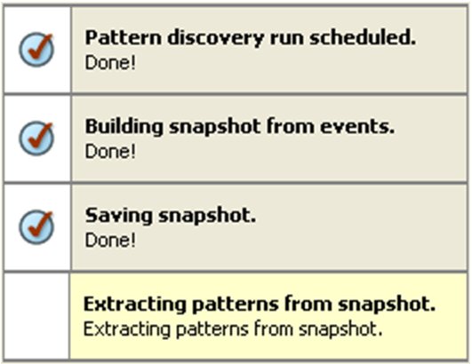 In the Viewer panel, the system processes the snapshot request and shows each process as the Pattern Discovery engine runs: