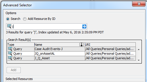 In the Search Result(s) panel, select the resource you want to add and click Add to display it in the Selected Resources panel.