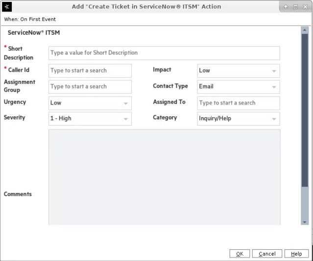 The Create Ticket in ServiceNow® ITSM panel provides all fields necessary to create a ticket. The following example shows that creation of the case is based on the On First Event trigger for this rule: