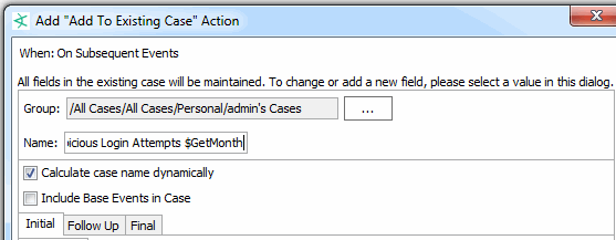 For the dynamic case name, specify the name based on the same case name you provided in the other rule action that creates the case. An example of a dynamic case name is one that includes a variable. In the example, GetMonth is a variable name, and so the dynamic name entry is Suspicious Login Attempts $GetMonth. If your variable name has spaces, replace the spaces with the underscore character. For example, if your variable is Get Month, then your case name is Suspicious Login Attempts $Get_Month.
