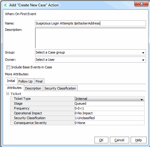 You can name a case in conjunction with an existing field value from an event. For example, you want your action to create a new case called Suspicious Login Attempts based on a value in the event field, Attacker Address. For this scenario, your case name’s format will be Suspicious Login Attempts $attackerAddress.