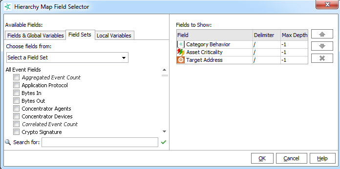 to open the Field Selector dialog. - Specify the fields by which you want to group events or objects by clicking Available Fields checkboxes, which adds them to “Fields to Show”. .
