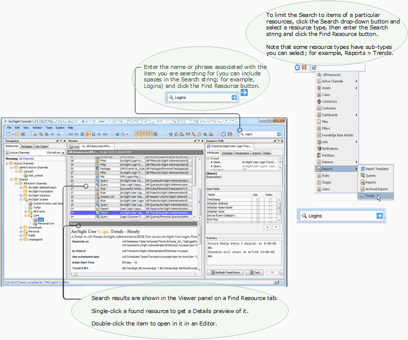 In the Viewer panel's Resource Search tab, enter a query string in the Search query line, set the number of results to allow, and click Find. See Using Text Search Syntax for guidance on search syntax.