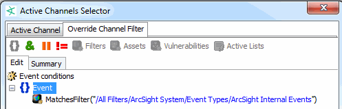 If you want to redefine or further narrow the stream of events in the selected channel, click the Override Channel Filter tab to add filters to it. The Override Channel Filter tab shows the conditions on the currently selected channel. You can add, remove, or modify the filters here.